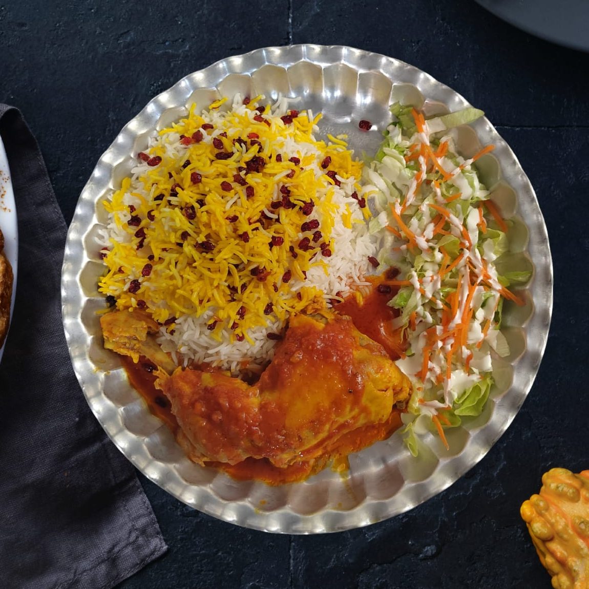 Riz pilaf parfumé aux baies d’épine-vinette (zereshk) et garni de morceaux de poulet mariné.